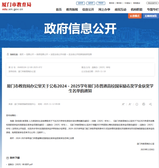 近日,厦门市教育局公布2024-2025学年厦门市普通高校国家励志奖学金获奖学生名单。其中,我校共180名优秀学子获此殊荣,每人奖励6000元。