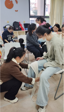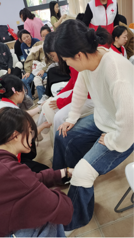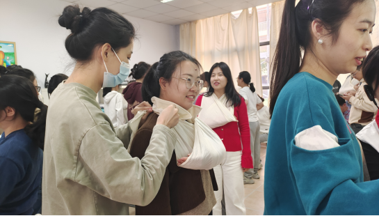 下午场则围绕气道梗阻急救与创伤包扎展开:讲师演示了海姆立克急救法(成人、儿童不同操作方式),并讲解了头部、手臂等部位的三角巾、绷带包扎技巧;学员们两两结对,在讲师指导下完成多种创伤场景的包扎实操,掌握了快速止血、固定伤处的实用技能。