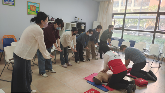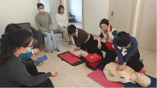 培训分上下午有序开展:上午场聚焦心肺复苏(CPR)与AED使用,培训讲师通过理论讲解+实操演示,详解心肺复苏的按压频率、深度等操作要点,以及AED设备的开机、电极片粘贴、一键除颤等关键步骤;学员们分组使用模拟人、教学用AED进行实操练习,讲师逐一纠正动作细节,确保操作规范。